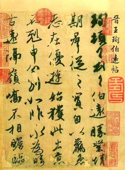 这幅字写完之后辗转流传,北宋时进入宫廷。艺术帝宋徽宗当然免不了时时把玩,还经常拿出来和米芾等书友讨论。随着北宋覆灭,这幅字流出宫廷,在民间流传颠沛很久。到了清代,酷爱收藏、盖章成瘾的另一艺术帝乾隆皇上终于得到了它。就此,他集成三大不世之宝:王羲之《快雪时晴帖》、王献之《中秋帖》、王珣《伯远帖》,王家终于大团圆,虽然是个三缺一,但是可以斗地主了。
